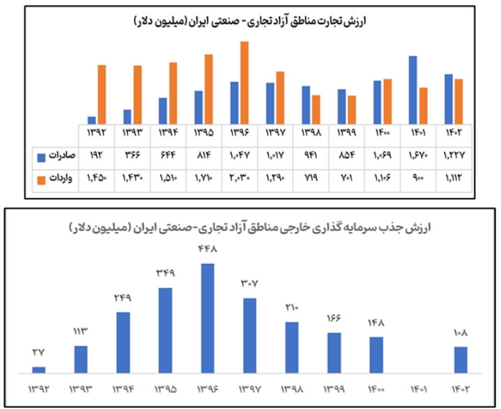 همانگونه که در نمودارهای زیر مشاهده میشود طی ۱۰ سال گذشته سهم مناطق آزاد کشور از تجارت خارجی کشور به طور میانگین کمتر از ۲ میلیارد دلار و میزان جذب سرمایهگذاری خارجی کمتر از ۲۰۰ میلیون دلار بوده است.
