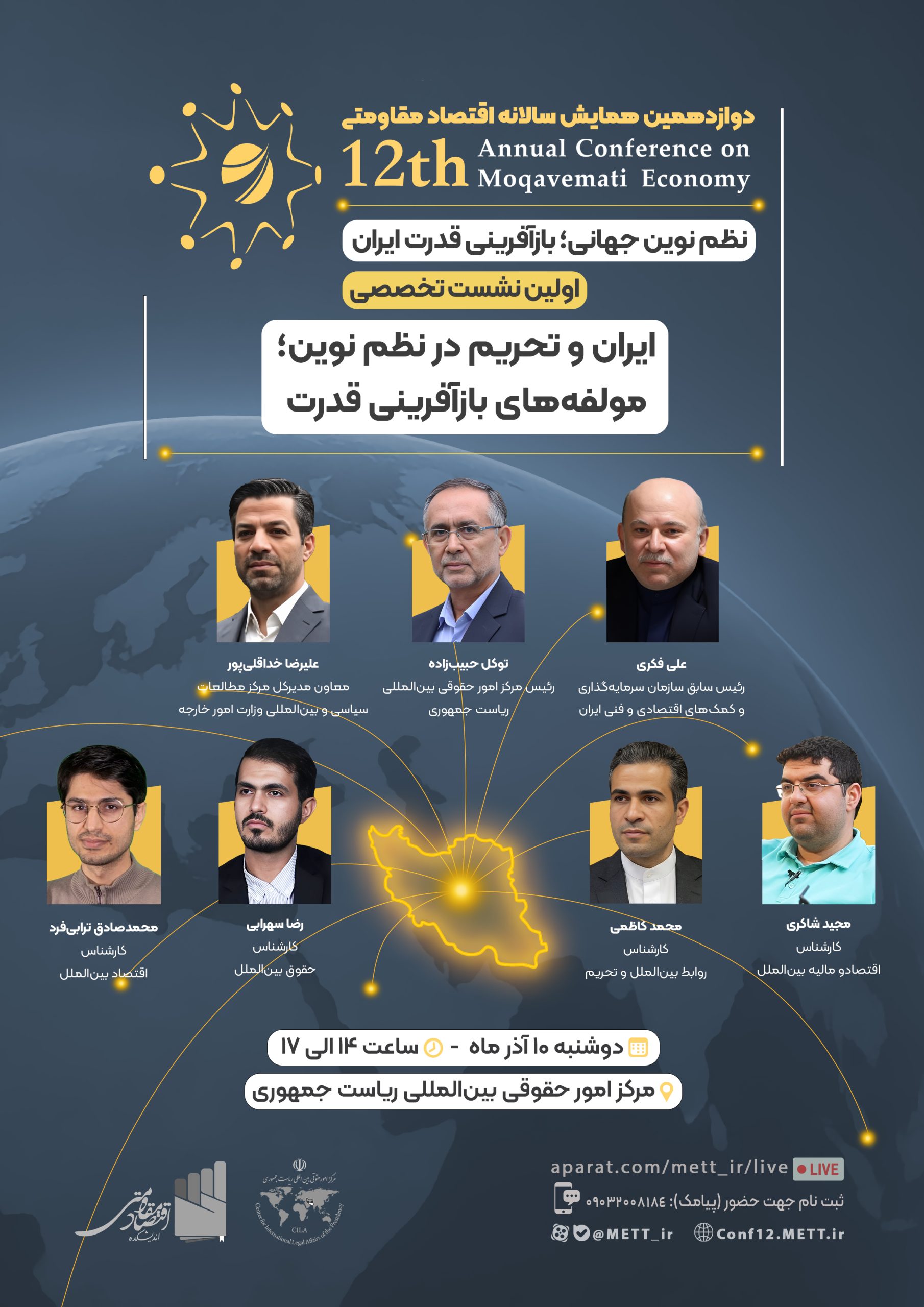 اولین نشست از دوازدهمین همایش سالانه اقتصاد مقاومتی با موضوع «ایران و تحریم در نظم نوین؛ مولفههای بازآفرینی قدرت»، دوشنبه ۱۰ آذرماه ۱۴۰۴ از ساعت ۱۴ الی ۱۷ و با میزبانی «مرکز امور حقوقی بینالمللی ریاست جمهوری» برگزار میشود.