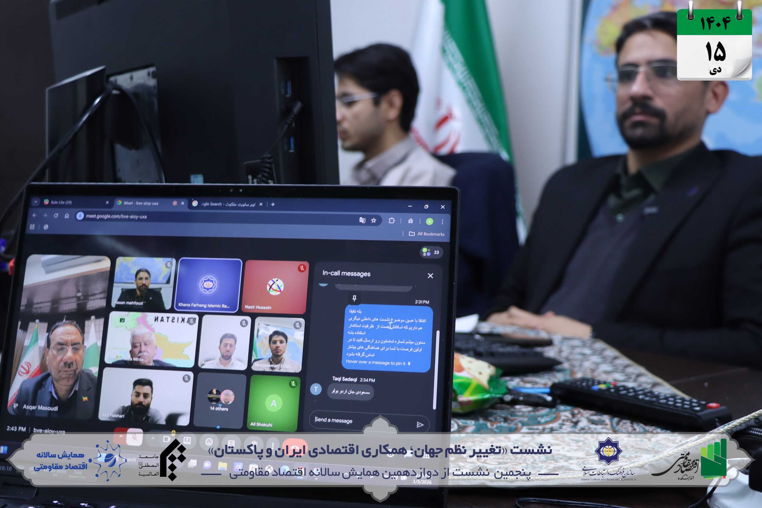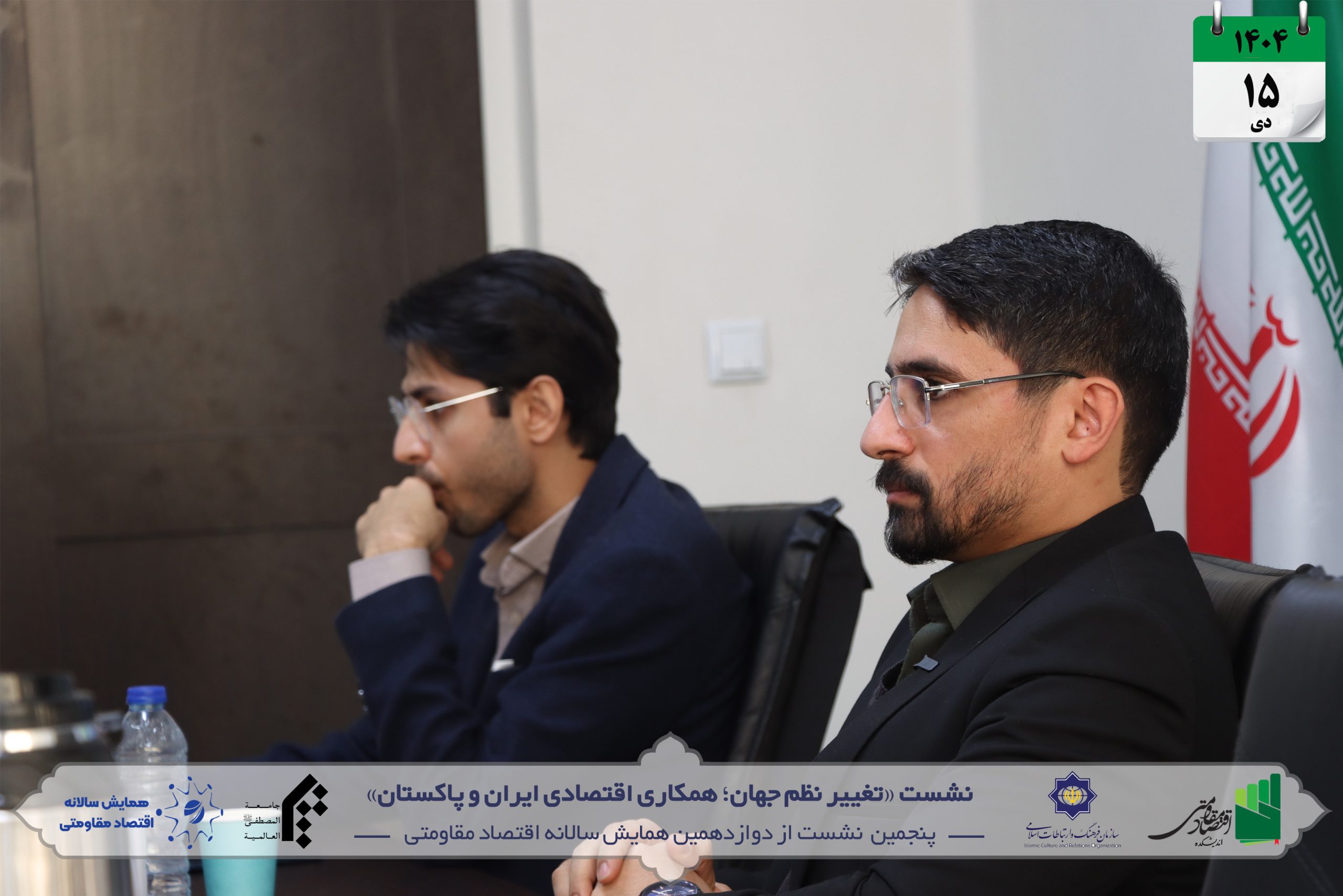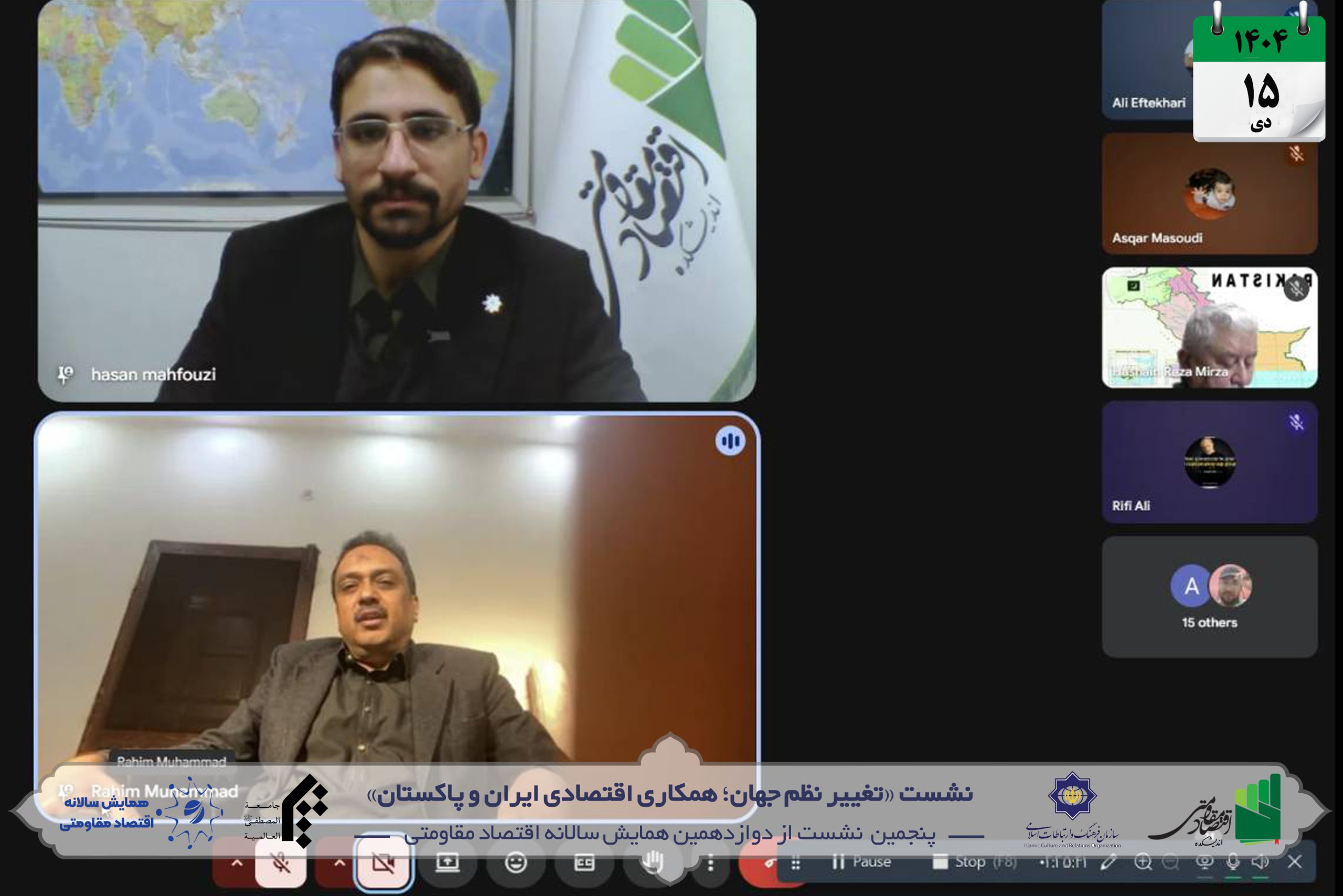 به گزارش واحد رویداد اندیشکده اقتصاد مقاومتی، نشست «تغییر نظم جهان؛ همکاری اقتصادی ایران و پاکستان» به عنوان پنجمین نشست از دوازدهمین همایش سالانه اقتصاد مقاومتی در تاریخ دوشنبه ۱۵ دیماه ۱۴۰۴ از ساعت ۱۳ الی ۱۶ به وقت ایران، با مشارکت اندیشکده اقتصاد مقاومتی، جامعه المصطفی العالمیه و سازمان فرهنگ و ارتباطات و با حضور کارشناسان و مسئولین مرتبط برگزار شد.