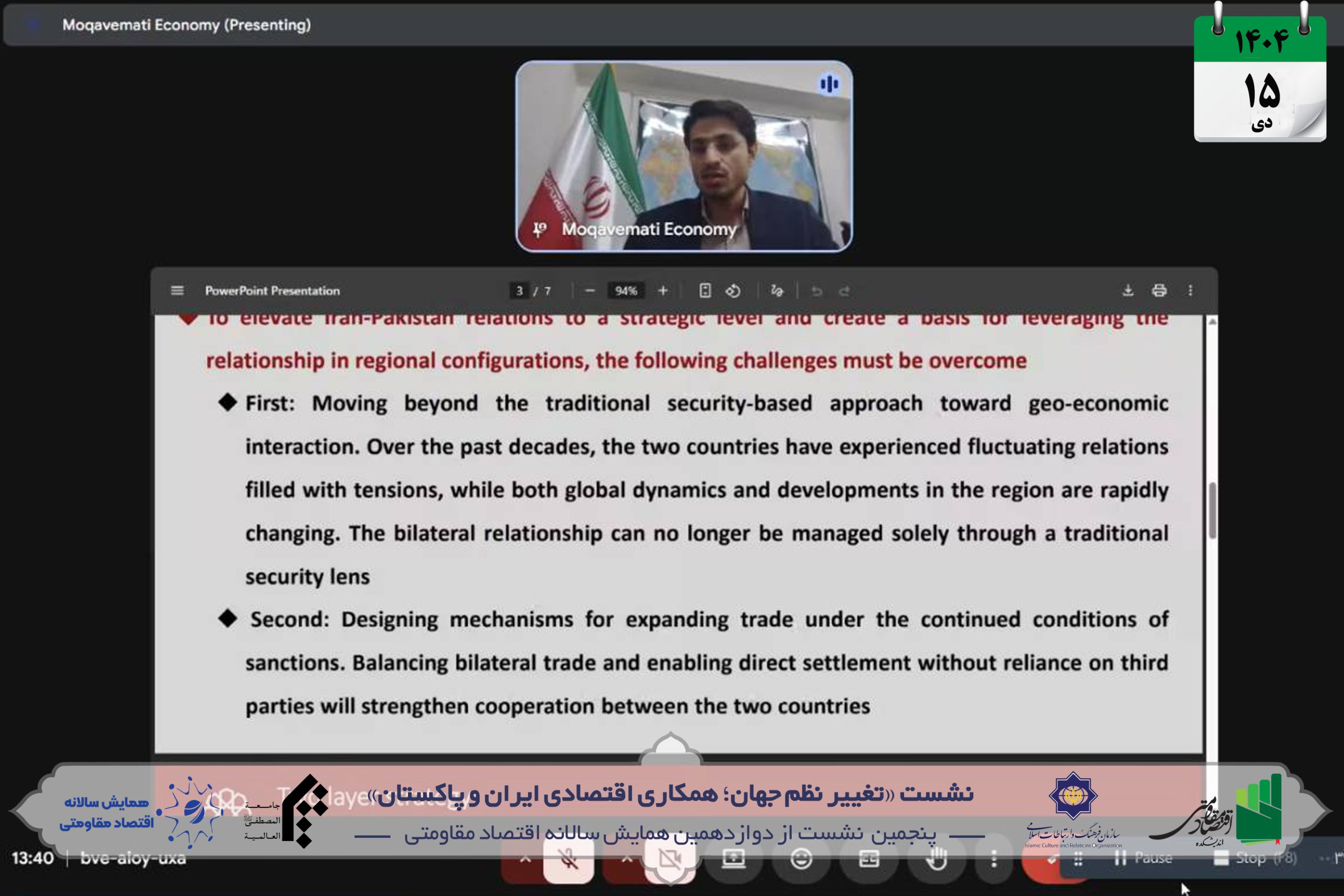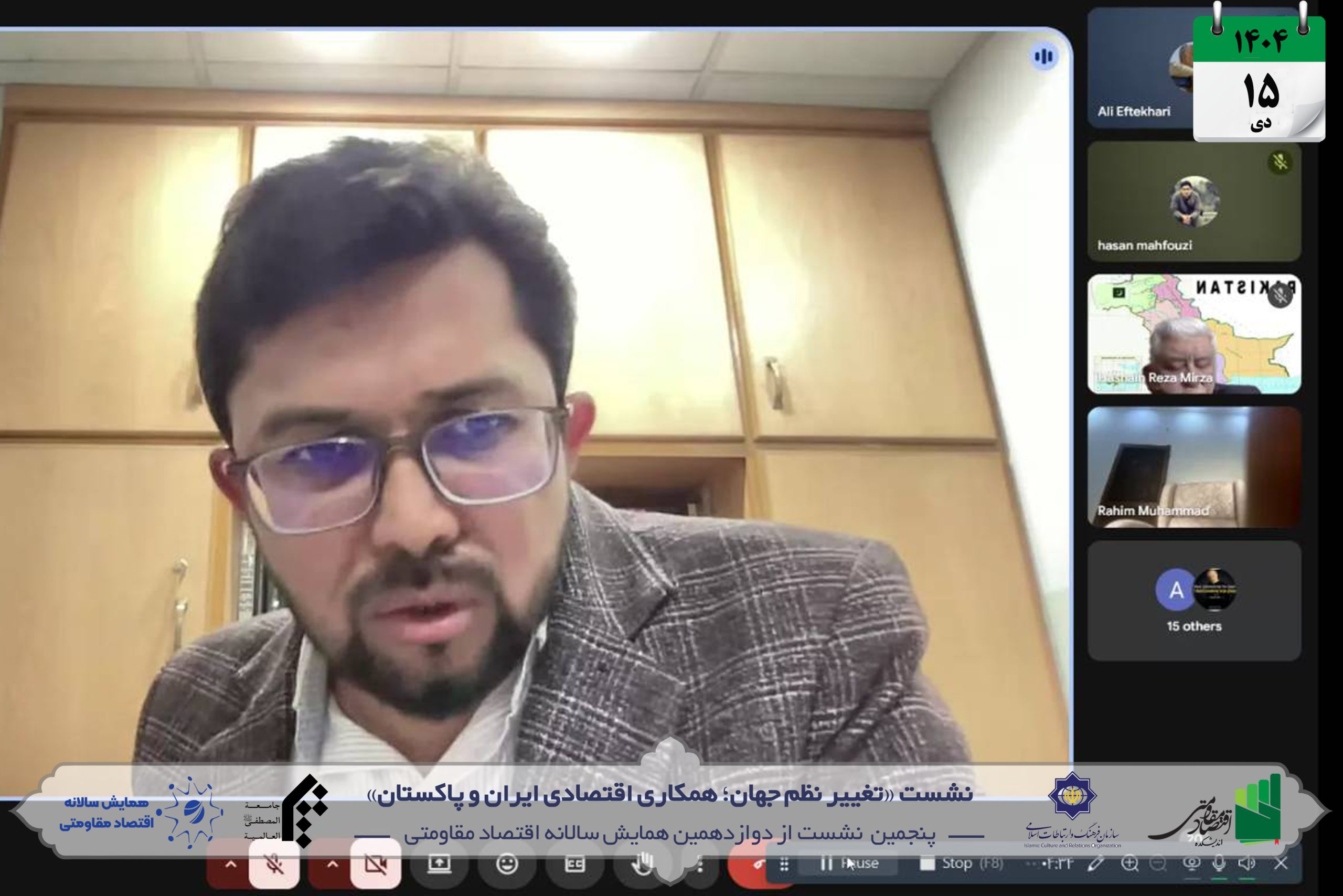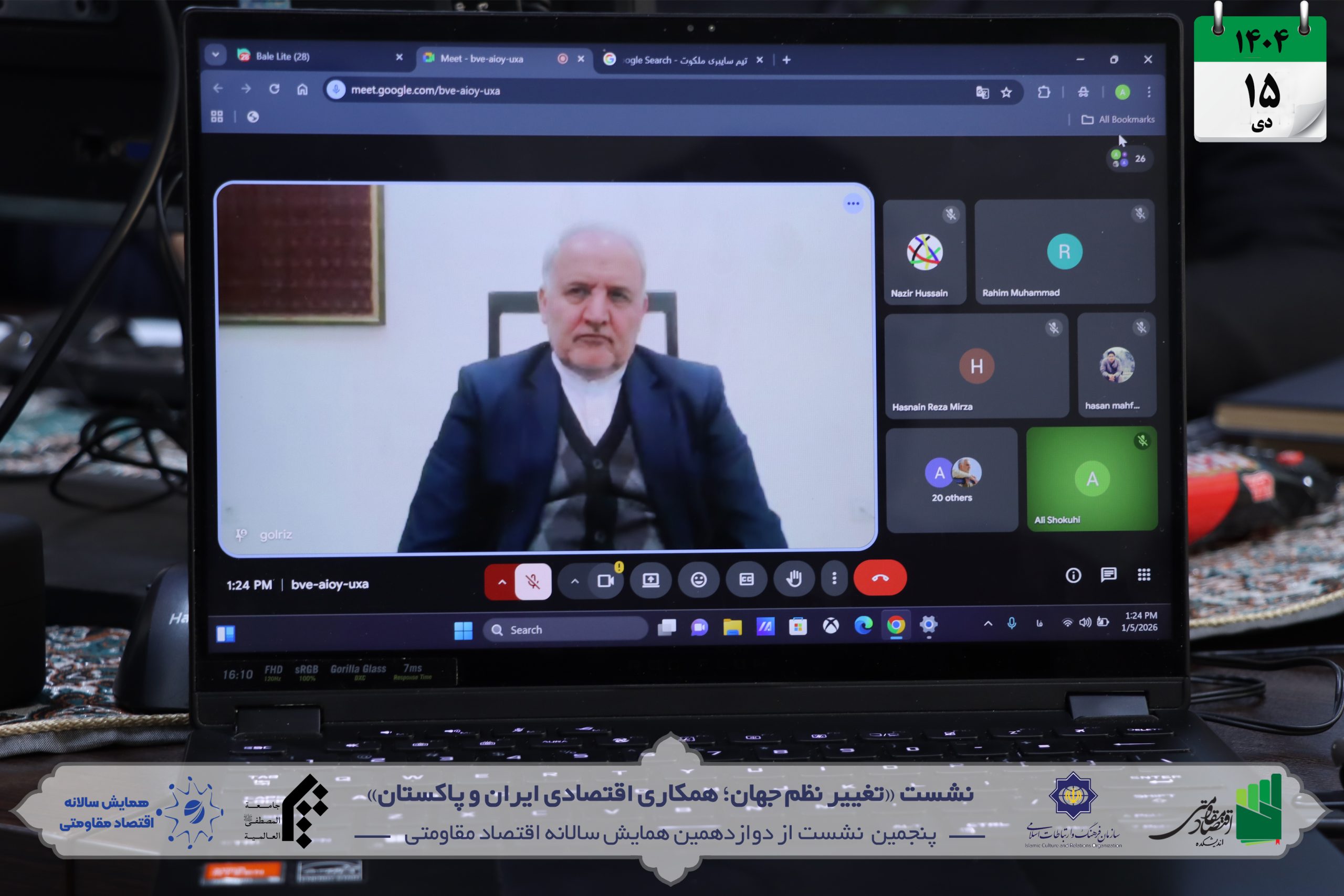 به گزارش واحد رویداد اندیشکده اقتصاد مقاومتی، نشست «تغییر نظم جهان؛ همکاری اقتصادی ایران و پاکستان» به عنوان پنجمین نشست از دوازدهمین همایش سالانه اقتصاد مقاومتی در تاریخ دوشنبه ۱۵ دیماه ۱۴۰۴ از ساعت ۱۳ الی ۱۶ به وقت ایران، با مشارکت اندیشکده اقتصاد مقاومتی، جامعه المصطفی العالمیه و سازمان فرهنگ و ارتباطات و با حضور کارشناسان و مسئولین مرتبط برگزار شد.