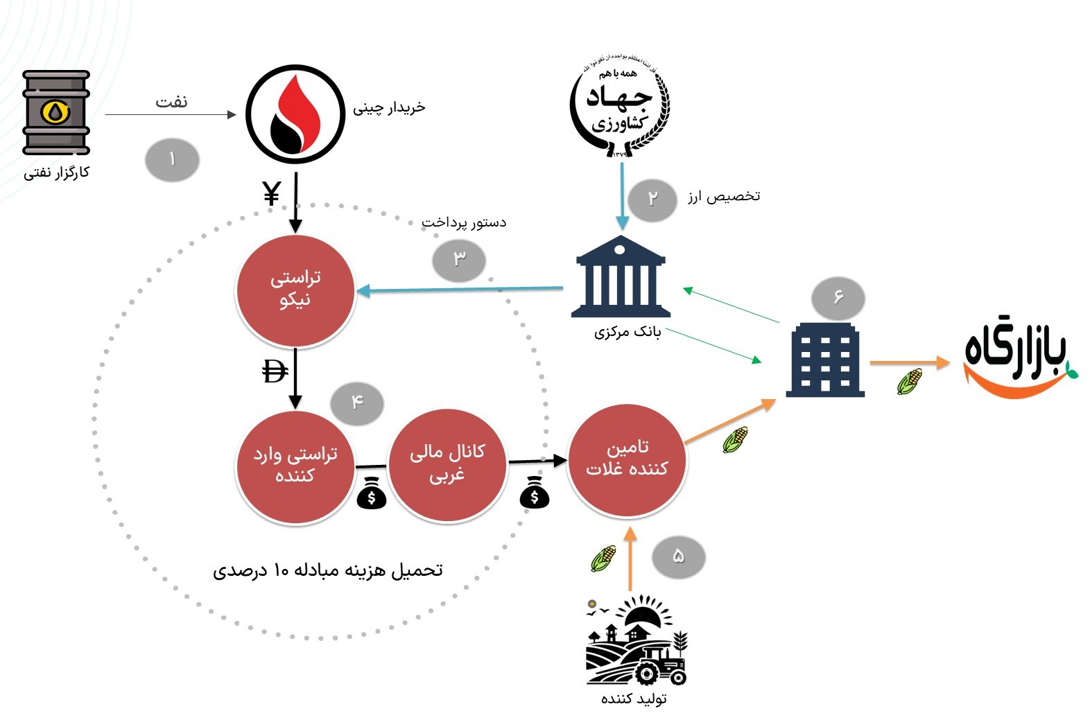 پس از تخصیص، مرحلهی اجرایی انتقال وجه آغاز میشود. بانک مرکزی به تراست بانکی خارجی که محل تجمیع درآمدهای نفتی است، دستور پرداخت صادر میکند. این تراست، منابع یوانی را از طریق سازوکارهای مالی و بانکی به یک تراست شرکتی منتقل میکند. نهاد واسط، با تبدیل یا استفاده از این منابع، پرداخت به تأمینکنندهی جهانی محصول کشاورزی را در قالب ارز مورد قبول طرف مقابل (مثلاً دلار یا یورو) انجام میدهد. به این ترتیب، رابطهی بین درآمدهای نفتی تحریم شده و خرید محصول کشاورزی در بازار جهانی برقرار میشود.