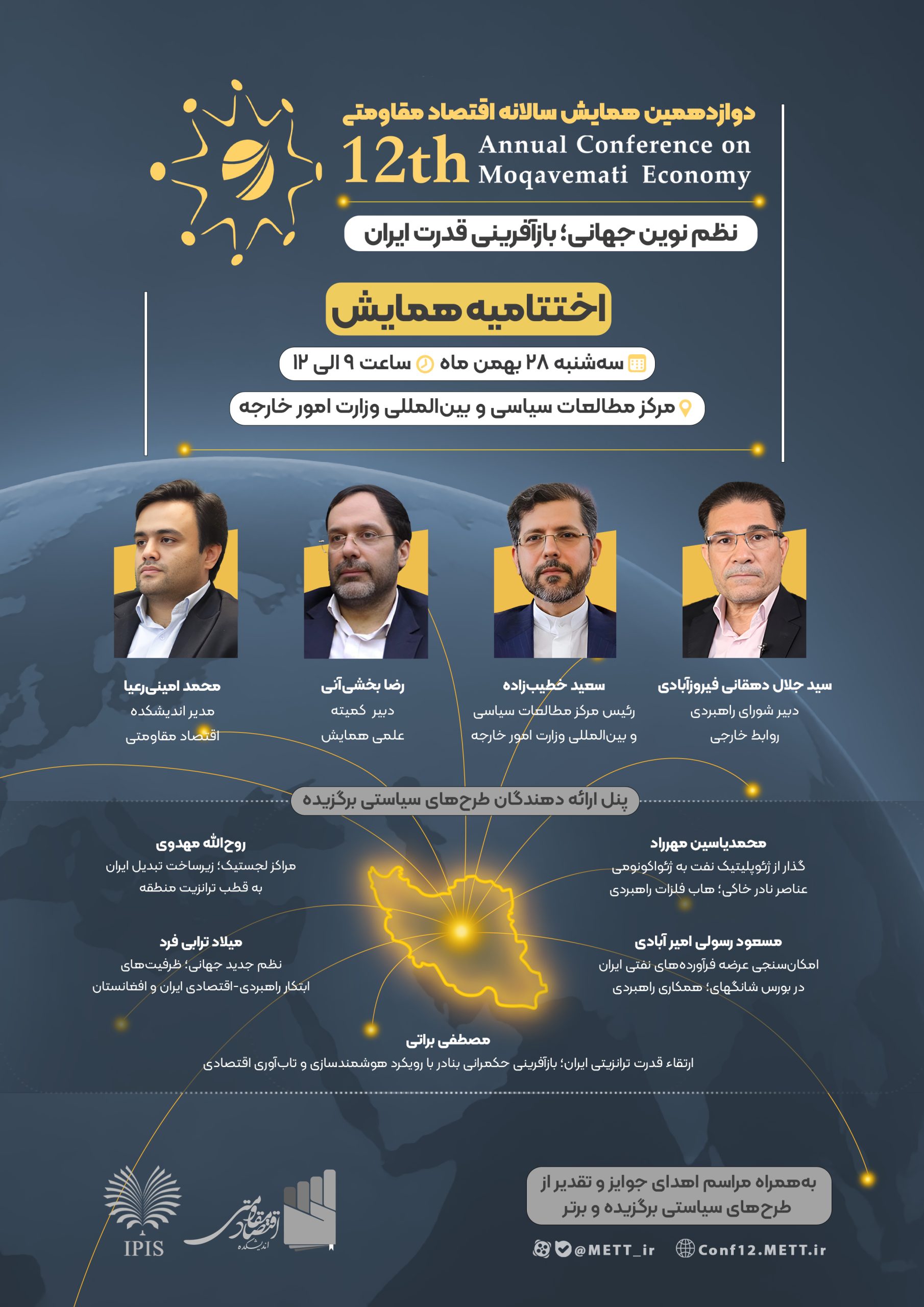 اختتامیه دوازدهمین همایش سالانه اقتصاد مقاومتی، آخرین بخش از فرآیند این رویداد سالانه است که در تاریخ سهشنبه ۲۸ ام اسفندماه ۱۴۰۴ از ساعت ۹ الی ۱۲ با میزبانی مرکز مطالعات سیاسی و بینالمللی وزارت امور خارجه به نشانی تهران، خیابان شهید باهنر (نیاوران)، خیابان شهید آقایی برگزار میشود.